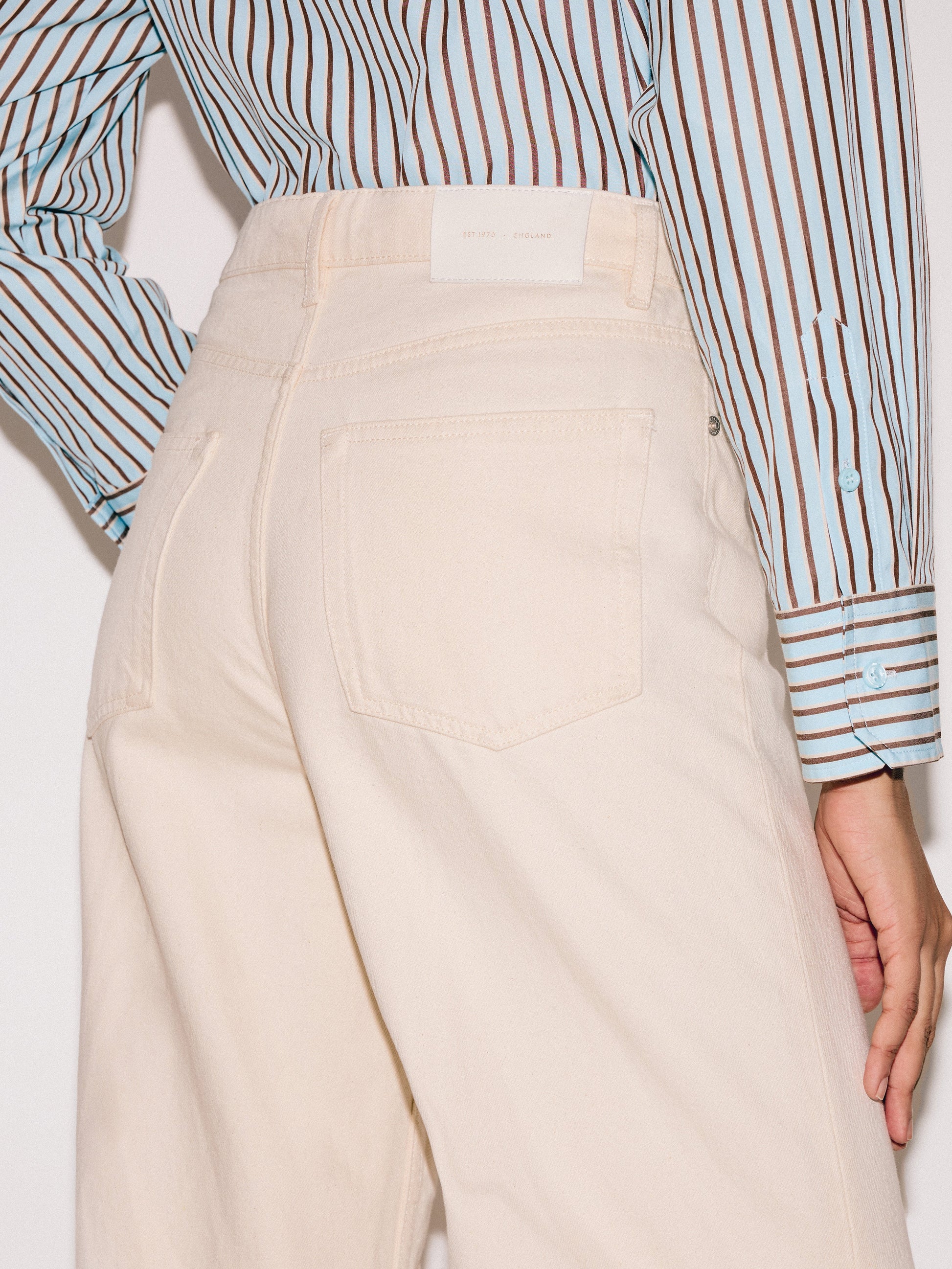 One of our best selling denim fits, the Balfour denim jean is essentially a longer version of the cropped Tyne jean. High rise, classic 5 pocket jean styling with a fly front. These jeans are ethically sourced and use recycled threads, recycled fabric for the pocket bags and recycled zip tape. Cut in a 100% fixed 'eggshell' cotton denim, aptly named for its textured appearance, this style is slim fitting throughout the waist and hips with a straight longer leg giving a lengthening illusion. Wear back with heeled boots and sandals.